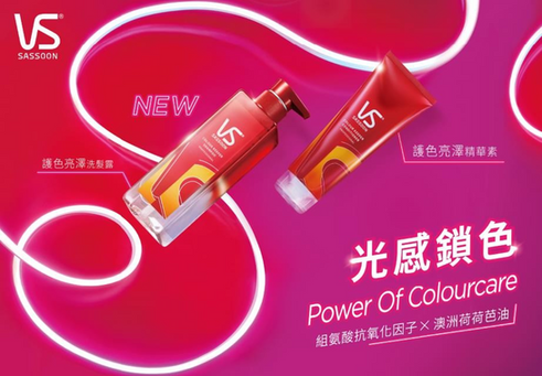 VS沙宣是顏色鮮明,風格強烈的品牌,其主視覺採用鮮豔的紅色與暈光文字結合,吸引追求時尚感的消費者。